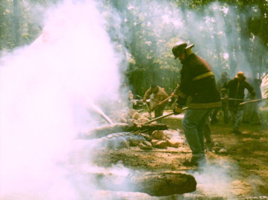 One of Westport’s elaborations is the way they build the fire. Unlike most clambakes, the one at Allen’s Neck isn’t done in a pit. Instead, the rocks are heated up in a crib of logs layered with stones that’s constructed sort of like a log cabin. Just before it’s lit, the pile reaches over 5 feet high. It burns from seven in the morning until 11:30, when a ceremony known as the rake-out begins. Raymond Duvall was the bakemaster—the man in charge of the fire—for over 50 years.