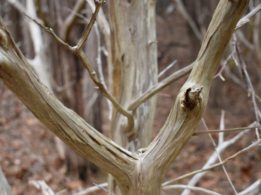 Located on the island’s northeastern end, on the way to the tip of Great Point, Coskata Woods rises out of the beach. This time of year, the maritime forest looks like it is made entirely of driftwood. Whipped by the wind, leafless trees contort like twisted spines of some ancient animal. Branches worn smooth, some as gray as a petrified whale’s rib. The landscape is so wildly different from the rest of the island, where trees usually give way to open sky. In the woods, shadows and light fall through a canopy of barren branches.