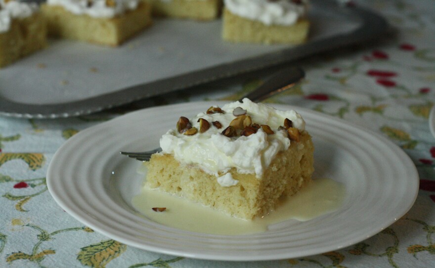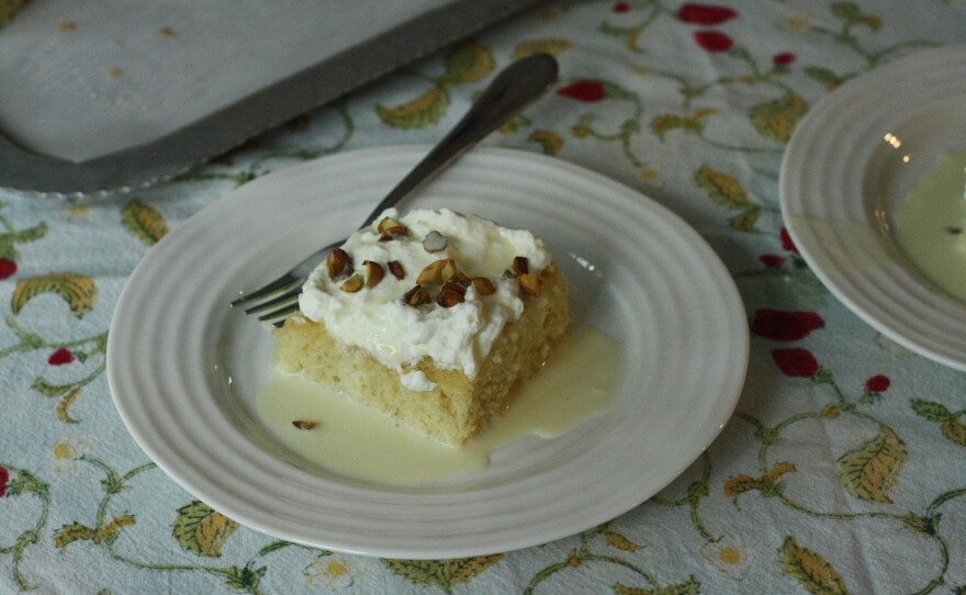 Stephanie: I cook a little bit but I mostly bake, so this is a Middle Eastern Dish. It's a saffron milk cake and it has saffron in the sponge and then saffron in the milk— so then you soak the sponge in some of the milk that also has saffron in it and that's whipped cream and pistachios on top.