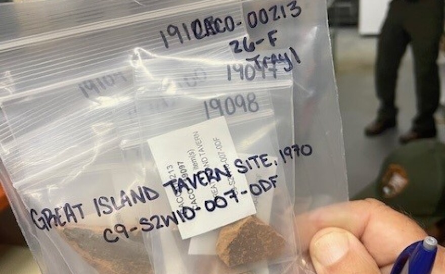 Rows of boxes hold 80,000 shards and chunks from a 1970 archeological dig at Smith Tavern on Great Island in Wellfleet, where people hung out in the 1700s. That sounds like a huge amount, but they’re mostly little chips of bowls, bottles, clay pipes, window (and drinking) glass, plaster, “not sexy stuff,” smiled Burke, though sometimes they fit together to create an evocative bowl.