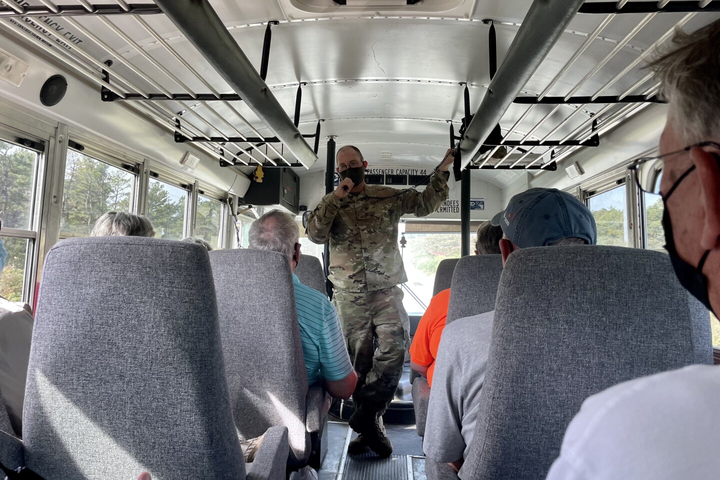 Major Alex McDonough leads a bus full of Cape Cod residents around the grounds of Camp Edwards. The 3-hour-long tours will be held up until the start of winter. Guard officials say they’re scheduled to resume in the spring. (Eve Zuckoff)
