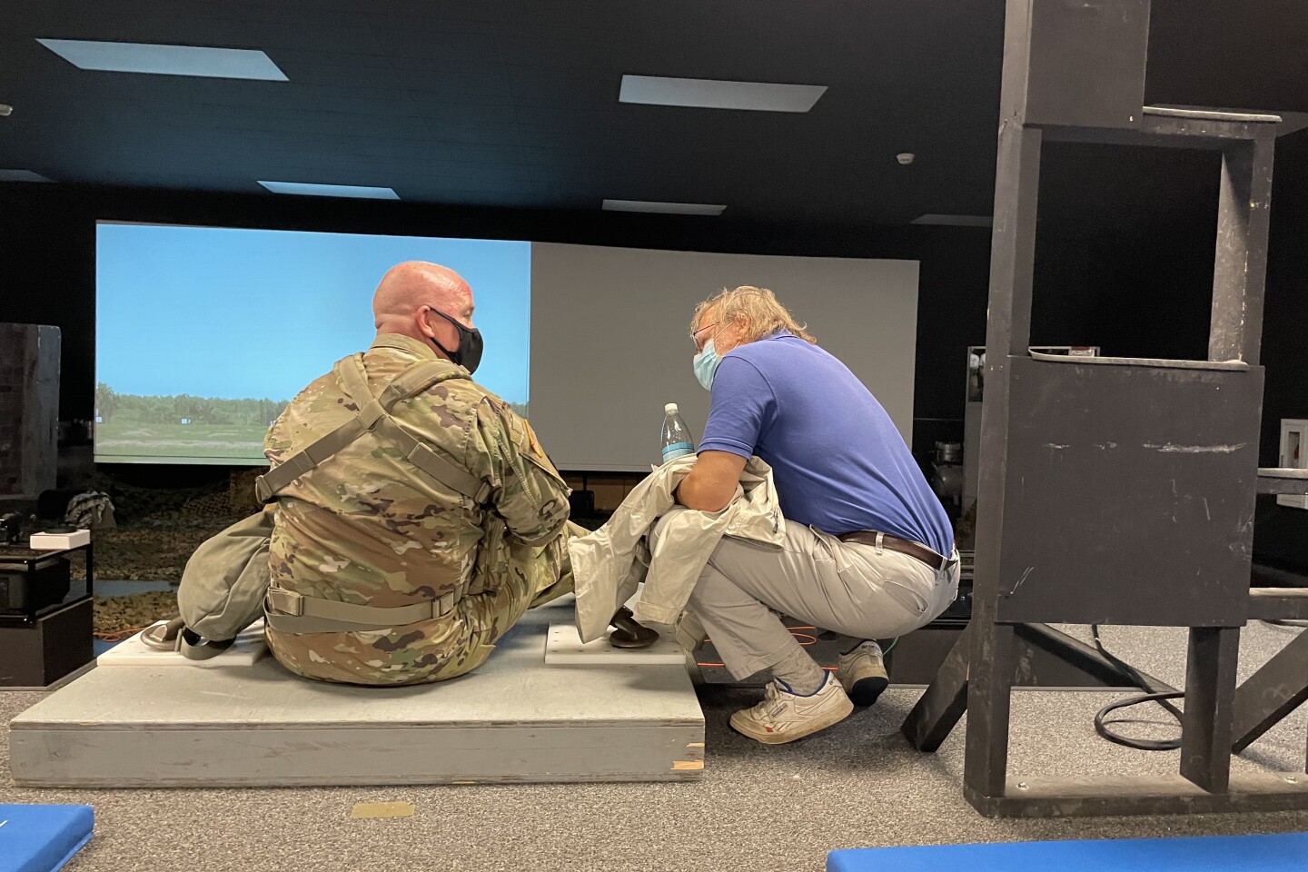 Base Commander for Camp Edwards Colonel Matthew Porter explains how virtual training works to a participant on the tour. The goal for members of the guards is to shoot from four different firing positions — laying down, up on their elbows, kneeling, and standing. Each person must hit 23/40 targets to get qualified on his or her assigned weapon.